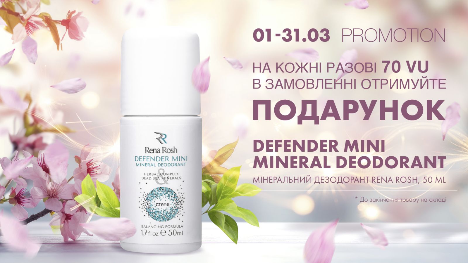 На кожні разові 70 VU у замовленні ви отримуєте подарунок - Defender Mini Mineral Deodorant від Rena Rosh (50 ml)